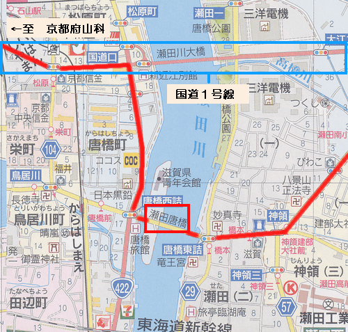 京阪石山坂本線唐橋前駅から徒歩5分、もしくは京都府道二号線を経由。